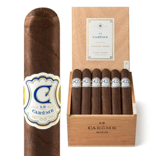 The Crowned Heads Le Carême Robusto is a medium-bodied cigar that offers a rich, dessert-like profile. Wrapped in a dark Connecticut Broadleaf wrapper, it delivers deep notes of cocoa, espresso, and sweet cream, balanced by hints of spice and earth. Beneath the wrapper lies an Ecuadorian Sumatra binder and Nicaraguan fillers, which add a smooth texture and subtle complexity to each puff. The smoke is velvety and satisfying, with a sweetness that lingers on the palate, making it a refined yet approachable cigar for those who enjoy balance over boldness.